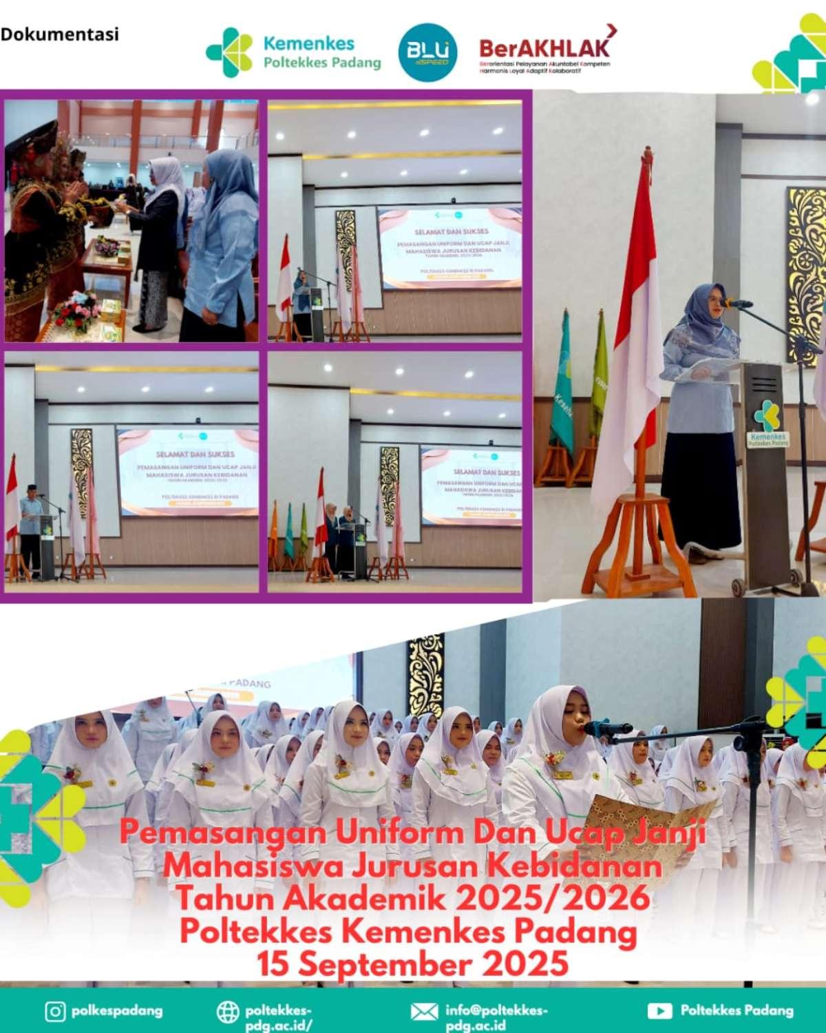Senin 15 September 2025 Poltekkes Kemenkes Padang melaksanakan Pemasangan Uniform dan Ucap Janji Mahasiswa Jurusan Kebidanan sebanyak 269 mahasiswa, yang terdiri dari 190 orang mahasiswa Prodi DIII Kebidanan Padang dan 79 orang mahasiswa Prodi DIII Kebidanan Bukittinggi. Pendidikan tingkat II semester III pada semester Ganjil TA 2025/2026.
