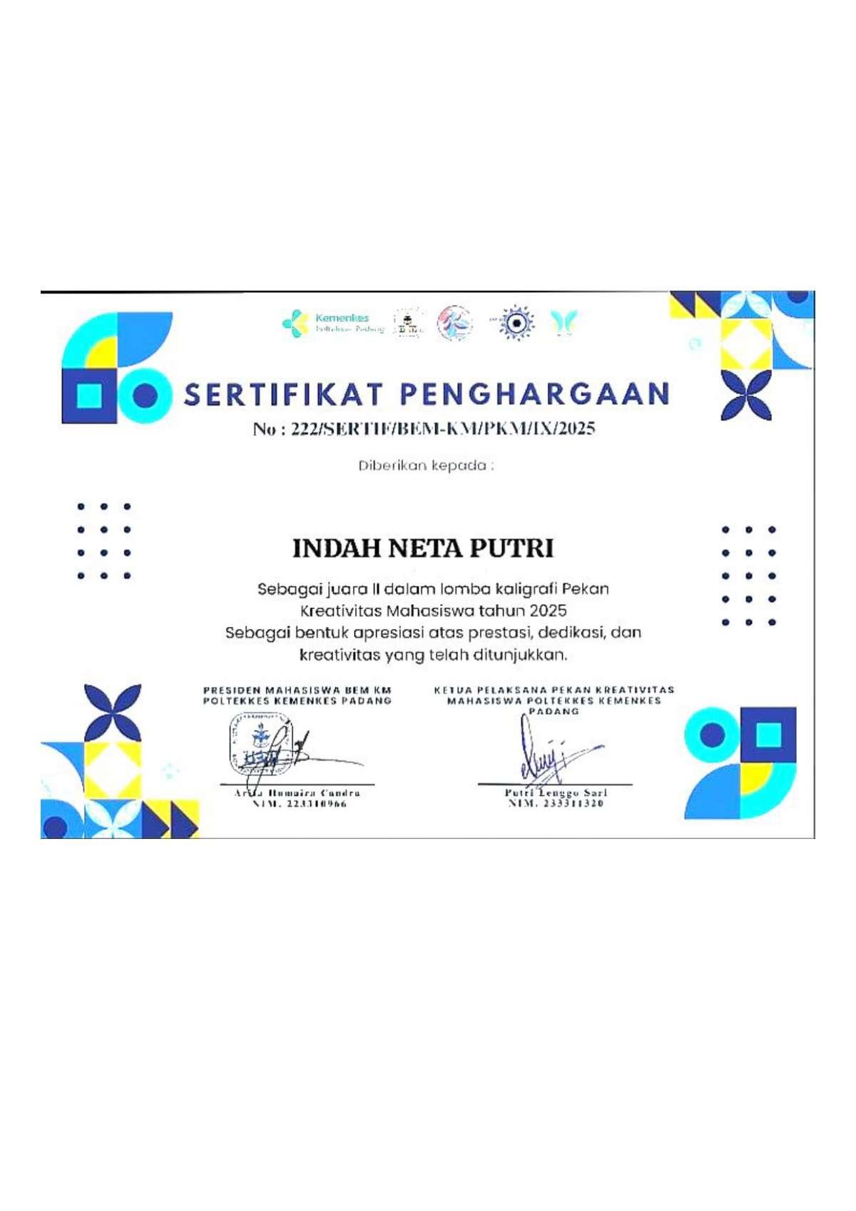 Mahasiswi atas nama Indah Neta Putri berhasil meraih juara 2 lomba kaligrafi dalam ajang Pekan Kreativitas Mahasiswa Dies Natalis Poltekkes Kemenkes Padang tahun 2025, menunjukkan keterampilan seni tulis indah dan apresiasi terhadap nilai-nilai islami.