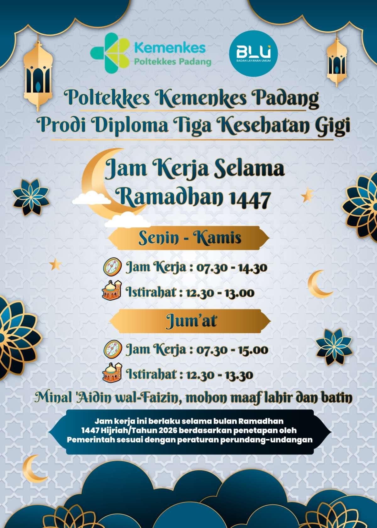 Dalam rangka menyambut bulan suci Ramadhan 1447 Hijriah/ Tahun 2026, Program Studi Diploma Tiga Kesehatan Gigi Poltekkes Kemenkes Padang menyesuaikan jadwal jam kerja pegawai sesuai ketentuan Kementerian Kesehatan.