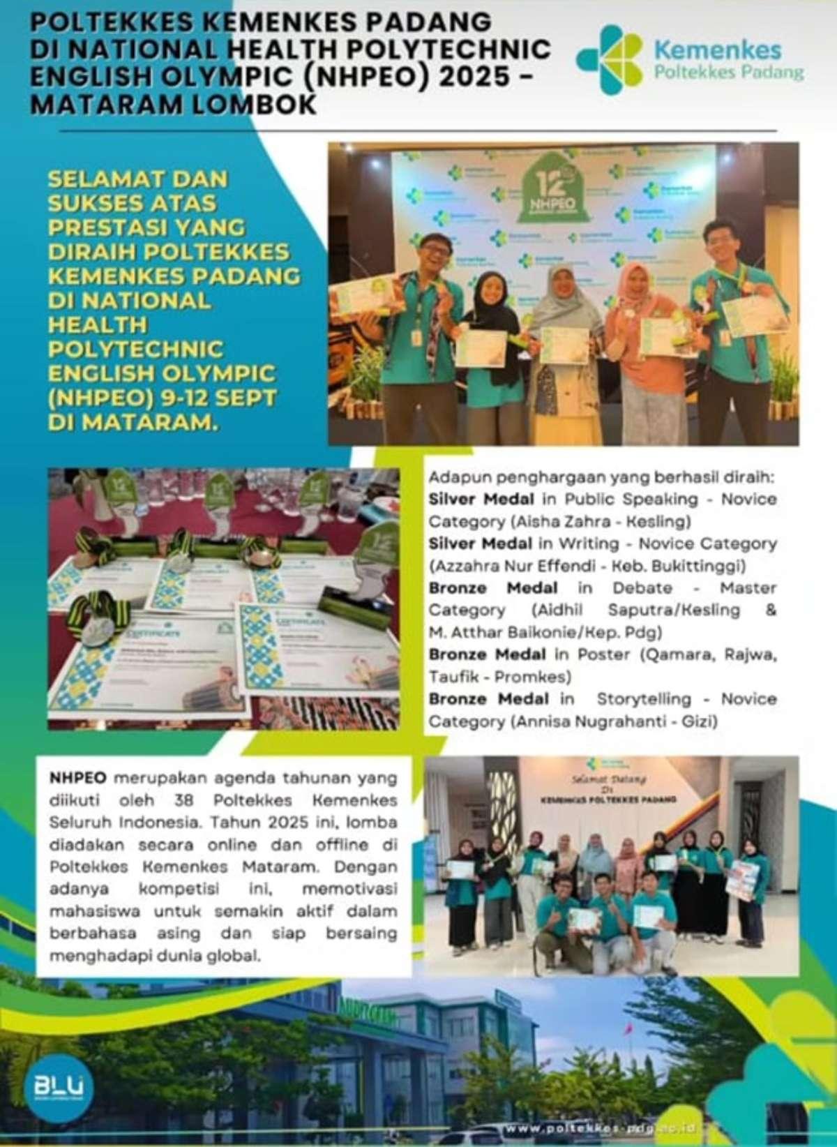 Selamat dan Sukses atas prestasi yang diraih Poltekkes Kemenkes Padang di National Health Polytechnic English Olympic (NHPEO) 9-12 Sept 2025 di Mataram