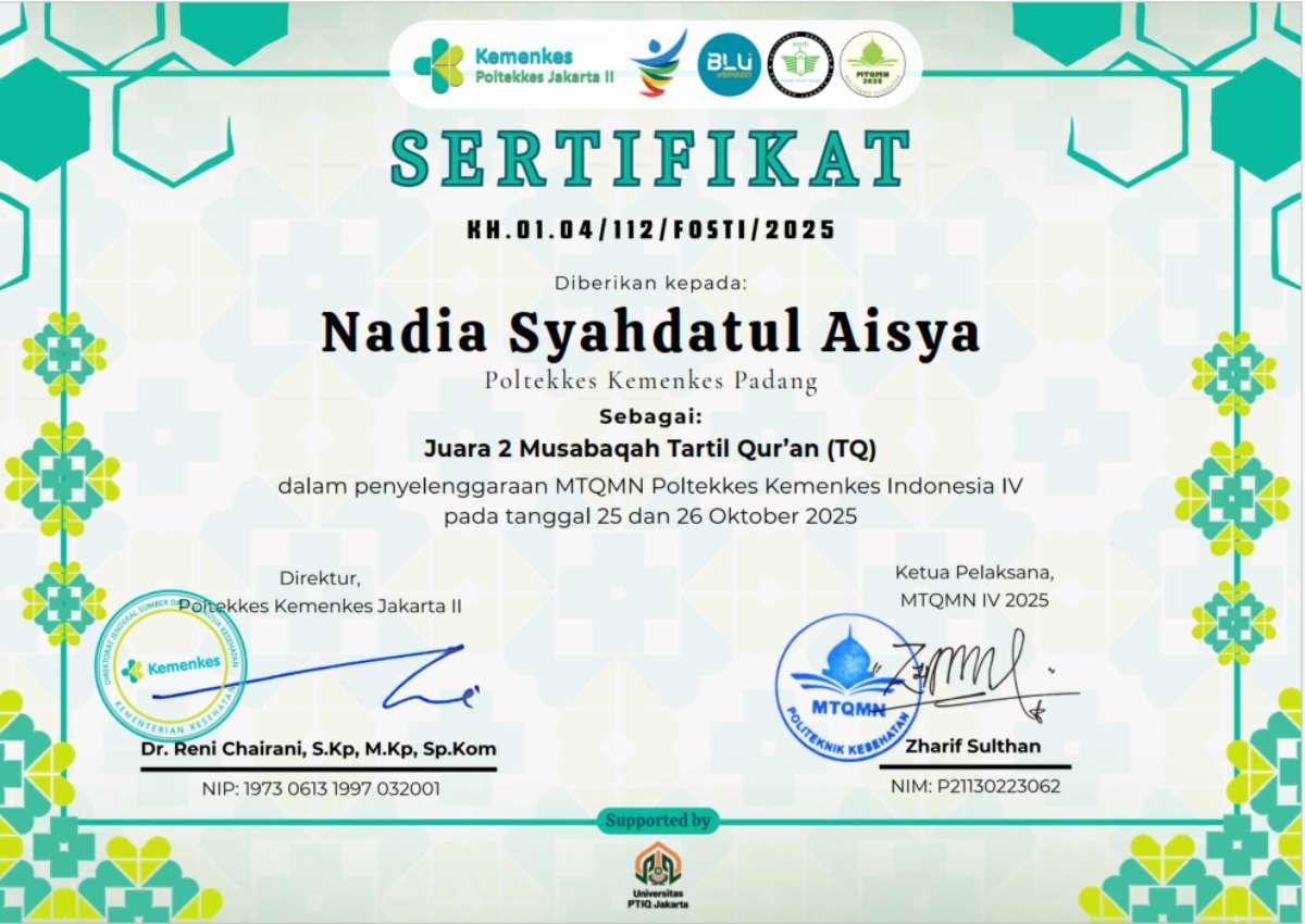 Dengan prestasi ini, Prodi Sarjana Terapan Kebidanan Poltekkes Kemenkes Padang semakin meneguhkan posisinya sebagai institusi pendidikan kebidanan yang tidak hanya unggul dalam akademik dan keterampilan klinik, tetapi juga dalam pengembangan nilai-nilai keagamaan dan moralitas peserta didik.