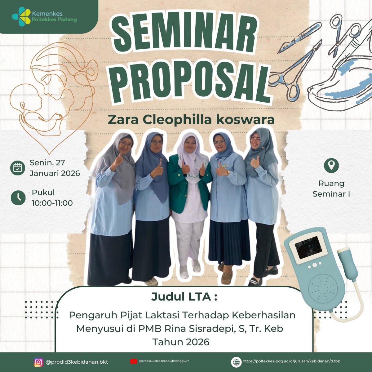 Bukittinggi, Senin, 26 Januari 2026 — Mahasiswa Program Studi Diploma Tiga Kebidanan Bukittinggi, Zara Cleophilla Koswara, telah melaksanakan Seminar Proposal Laporan Tugas Akhir (LTA) sebagai salah satu tahapan akademik dalam menyelesaikan studinya.